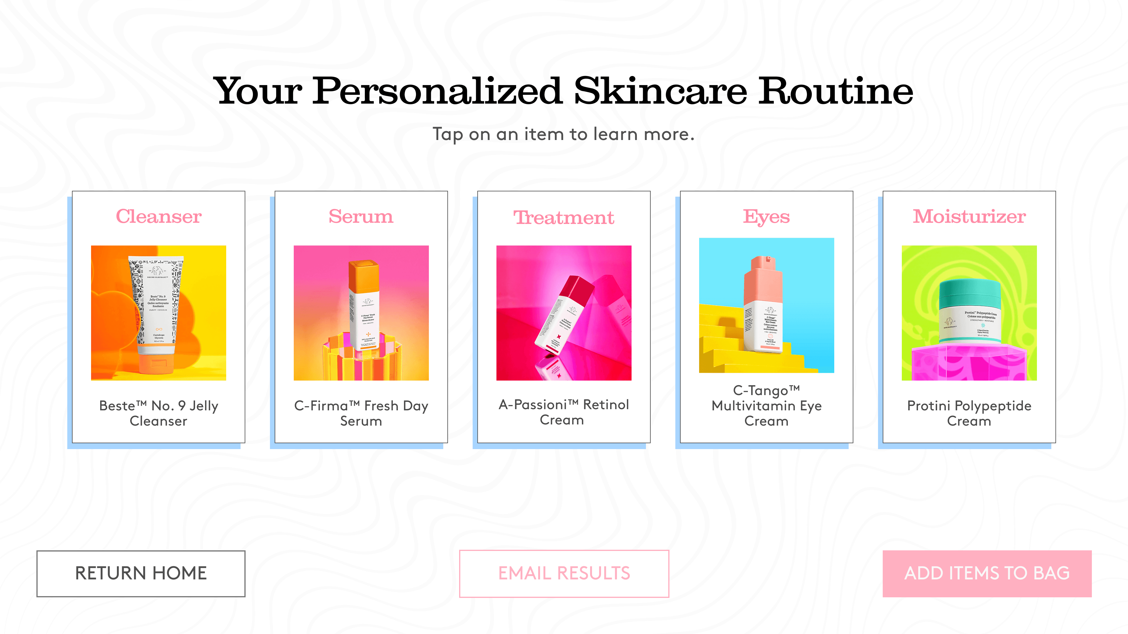 I researched and took several online skincare quizzes, including Curology, Ulta, CeraVe, and The Inkey List. I used these as inspiration to determine what kind of questions to ask, how to present the results, and how to apply the Drunk Elephant branding to my product.