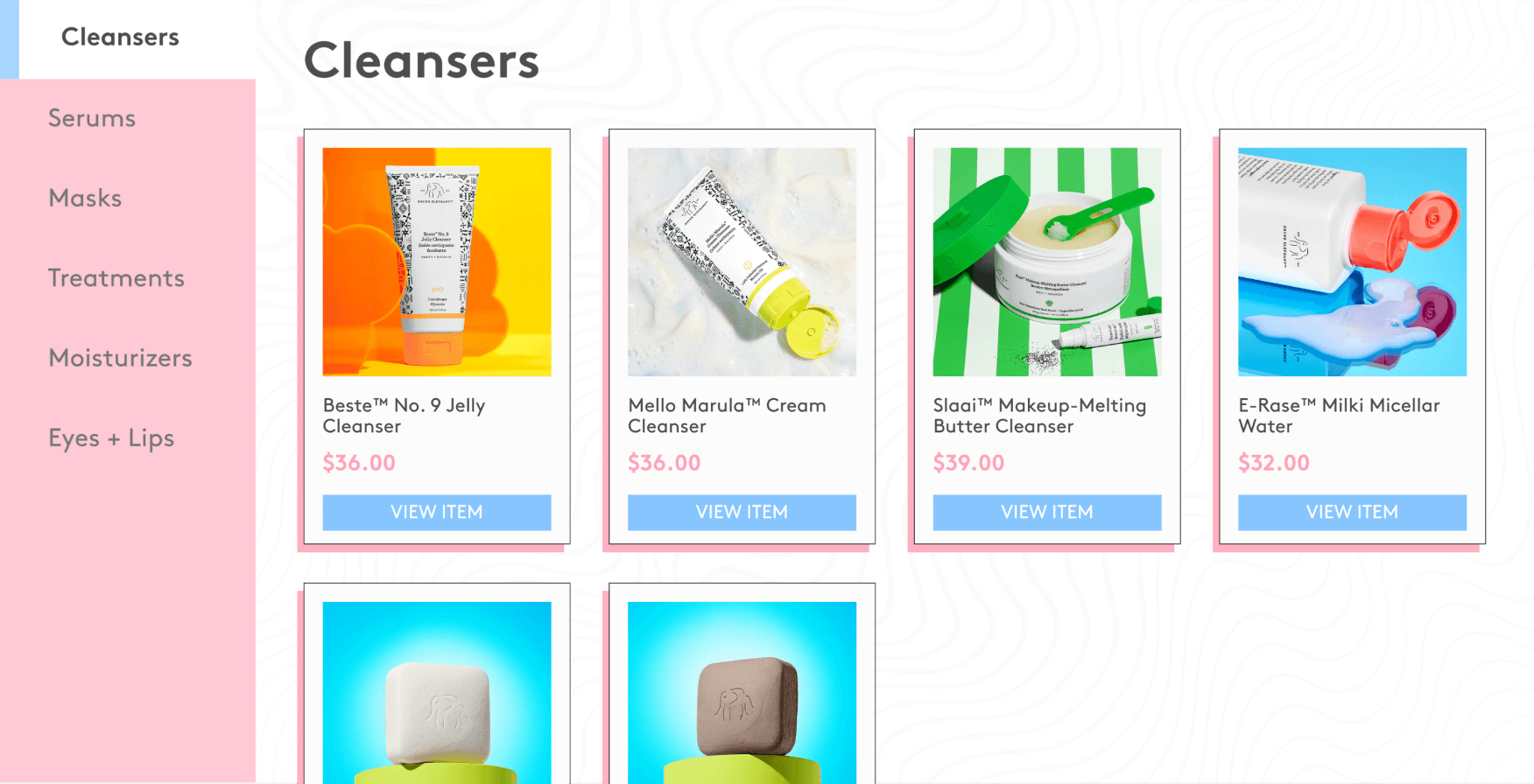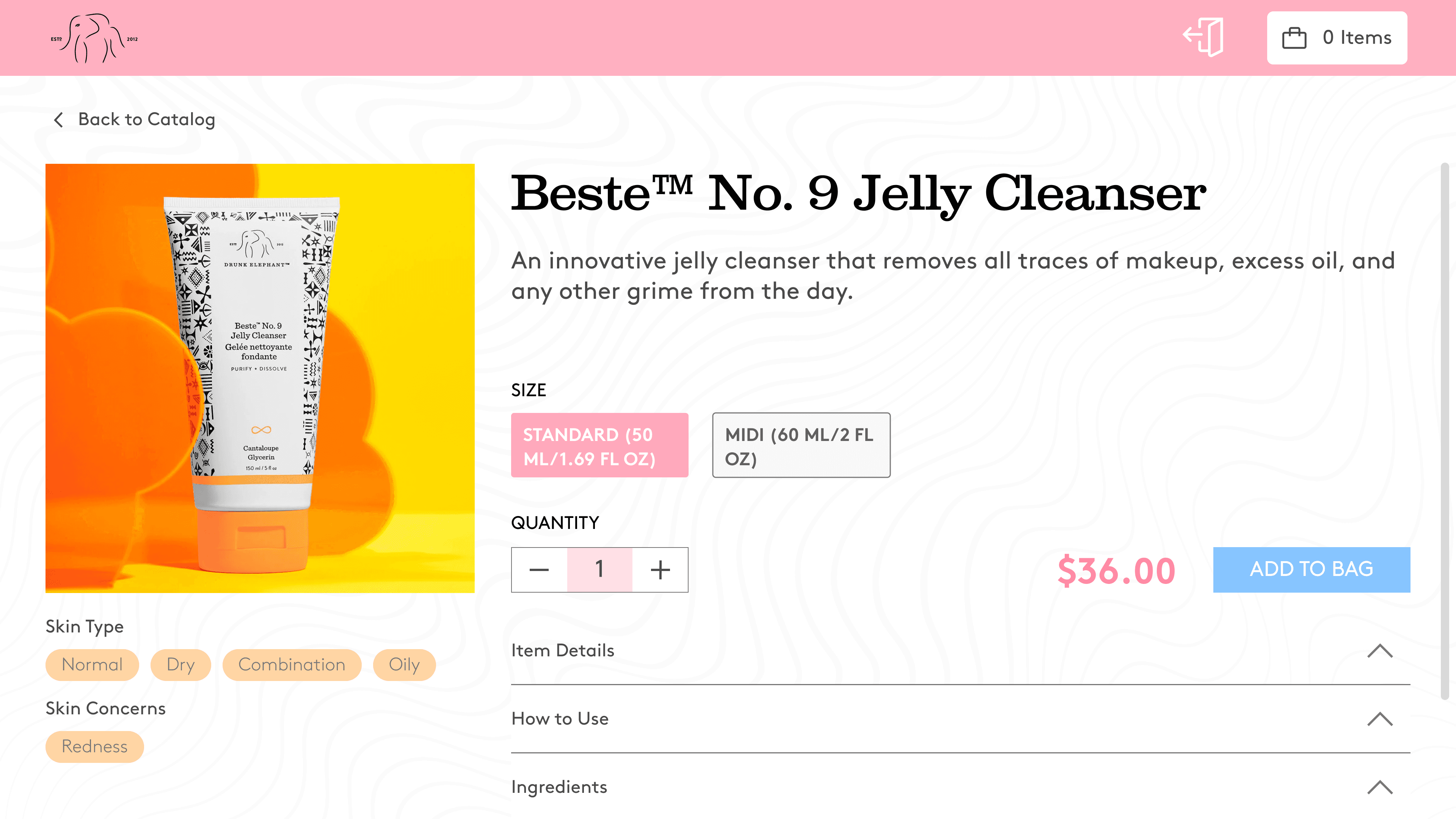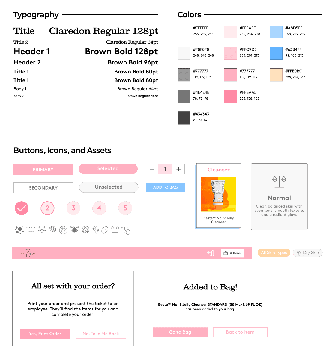 While I adhered to the Drunk Elephant branding style, including their fonts and light pastel color scheme, I created a UI design system to to design efficiently and ensure consistency. I kept in mind edge cases such as overflow text and secondary button states.